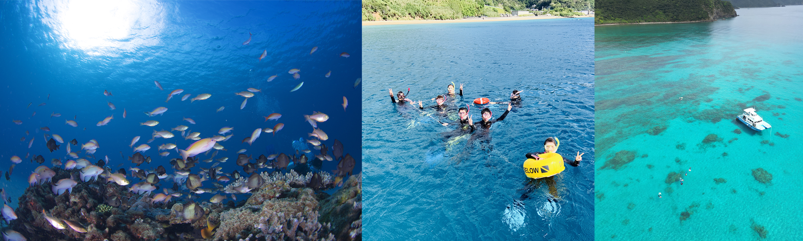 奄美大島南部は様々なシュノーケリングスポットが点在し、東西南北どの風が吹いても風を除ける場所があります。奄美大島南部と加計呂麻島の間にある「大島海峡」は、珊瑚や魚がわんさかでシュノーケリングにはうってつけ!空・山・森・海・海中の珊瑚が全部目に映り、海の中に顔をつければ生物多様性に溢れた別世界へ。
